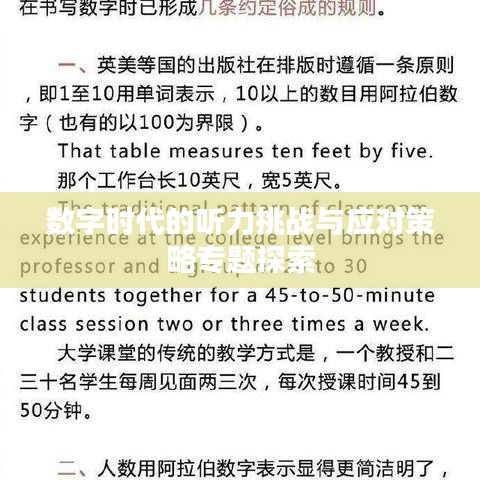 随着科技的飞速发展,我们进入了一个数字化时代,数字信息无处不在,无时不刻不在充斥着我们的生活,在这个时代,听力不再仅仅是简单的听取声音,更是在数字环境中处理、理解和分析声音的能力,本文将围绕“听力数字专题”展开讨论,探索数字时代的听力挑战及应对策略。